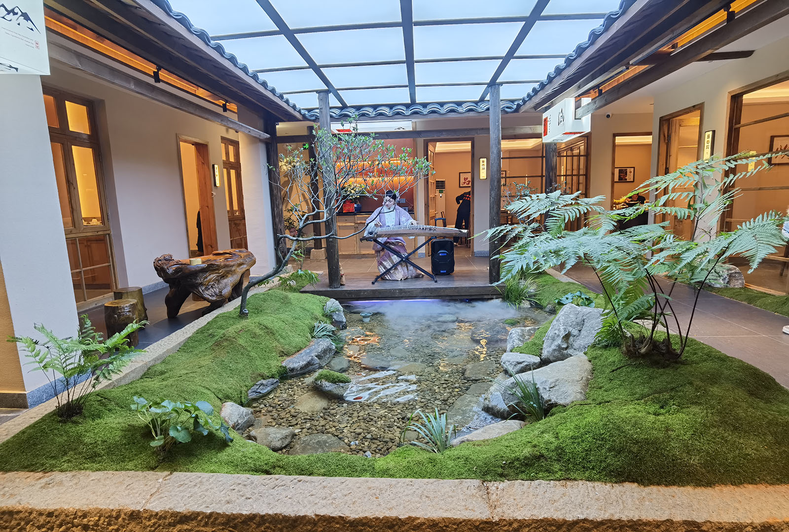 青石铺就的庭院里,苔藓覆满地面,清浅的溪流绕着山石蜿蜒而过,蕨类植物舒展着翠绿的枝叶。身着素雅汉服的琴师端坐于院中,指尖抚过古琴,悠扬的琴音在中式庭院的飞檐之下悠悠回荡,与周遭的草木、流水相融,将中式雅致与禅意氛围拉满。在这里,时光仿佛慢了下来,每一缕风、每一声琴音,都在诉说着东方美学的温柔与沉静。