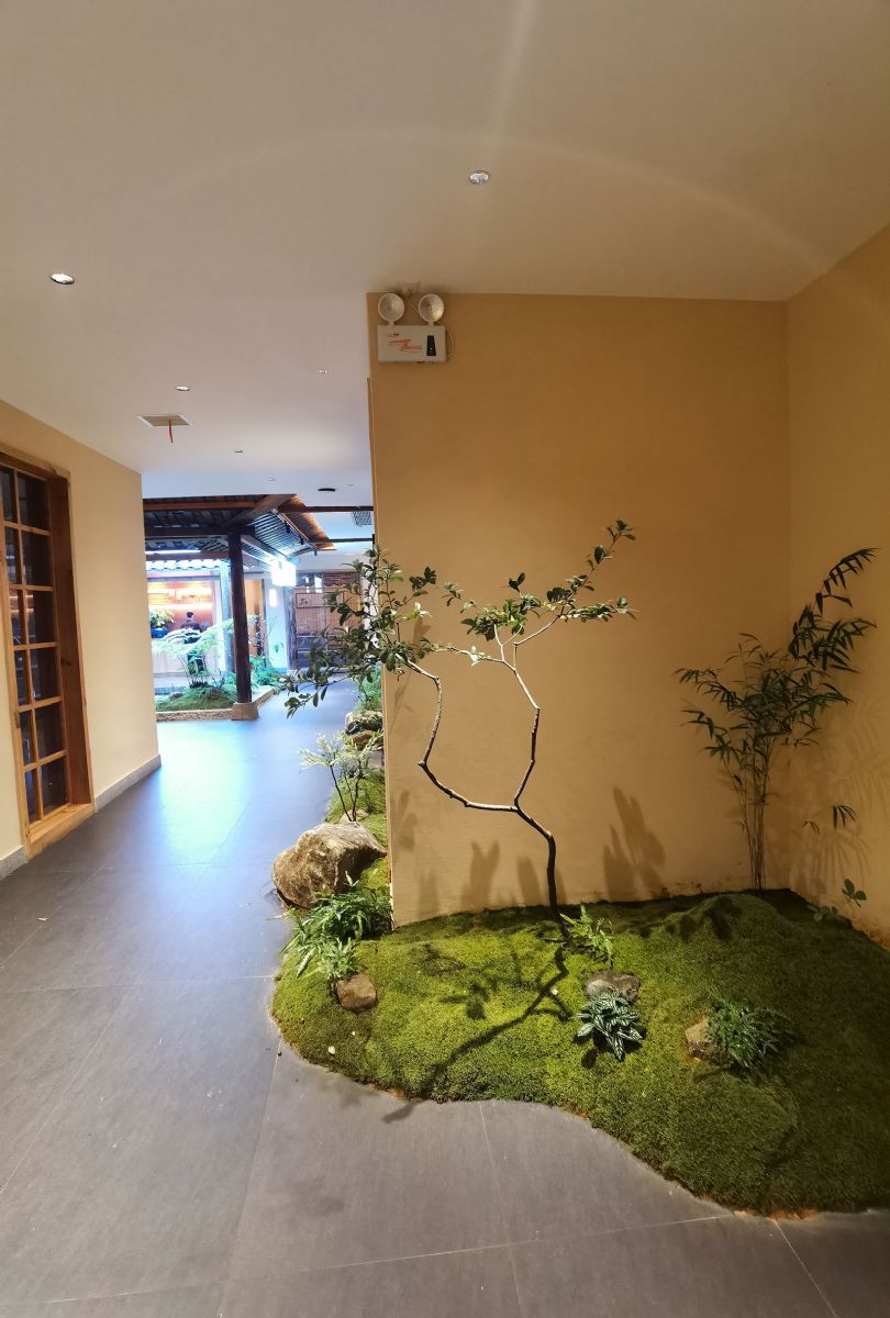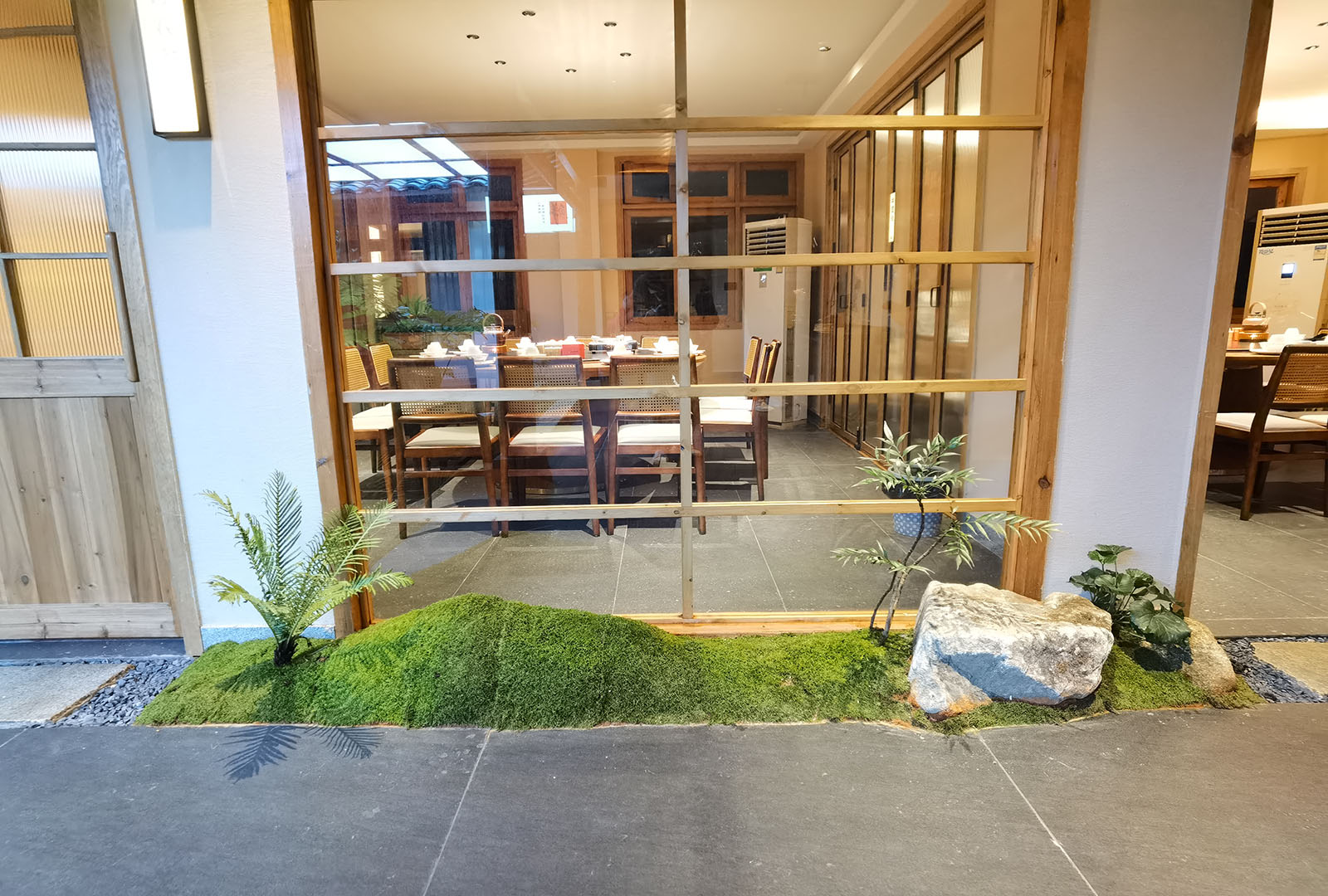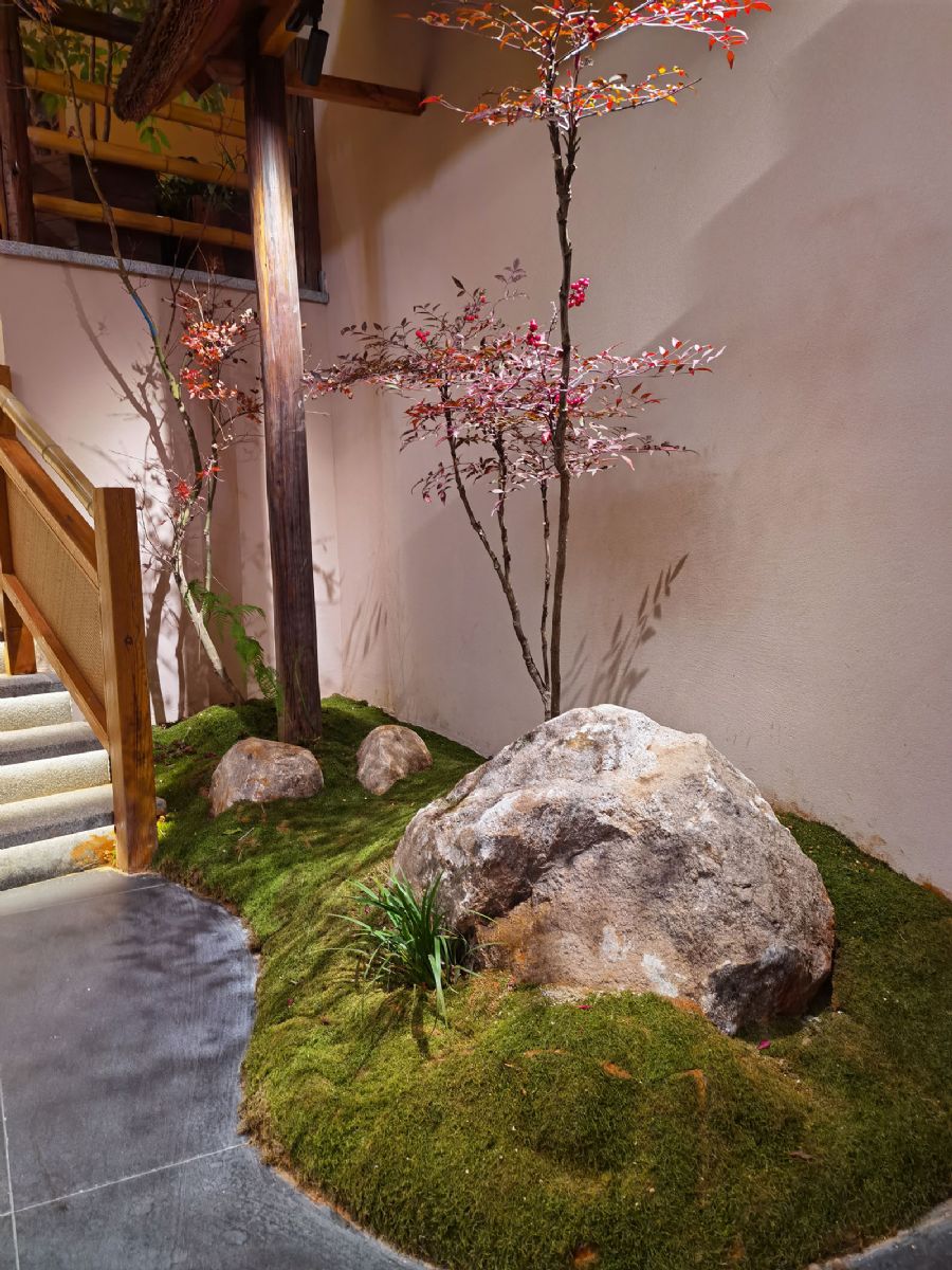 在室内的一方小天地里,苔藓如绿毯般铺展,错落的山石与疏朗的枯枝相映,将自然的清寂与雅致揉进了日常空间。暖调的墙面晕染出温柔氛围,与苔藓的鲜活绿意相融,仿佛把山野间的静谧搬进了室内。在这里,无需远寻,就能在苔痕微润、枝影婆娑里,邂逅东方美学里的返璞归真,是喧嚣生活里的一处治愈角落。